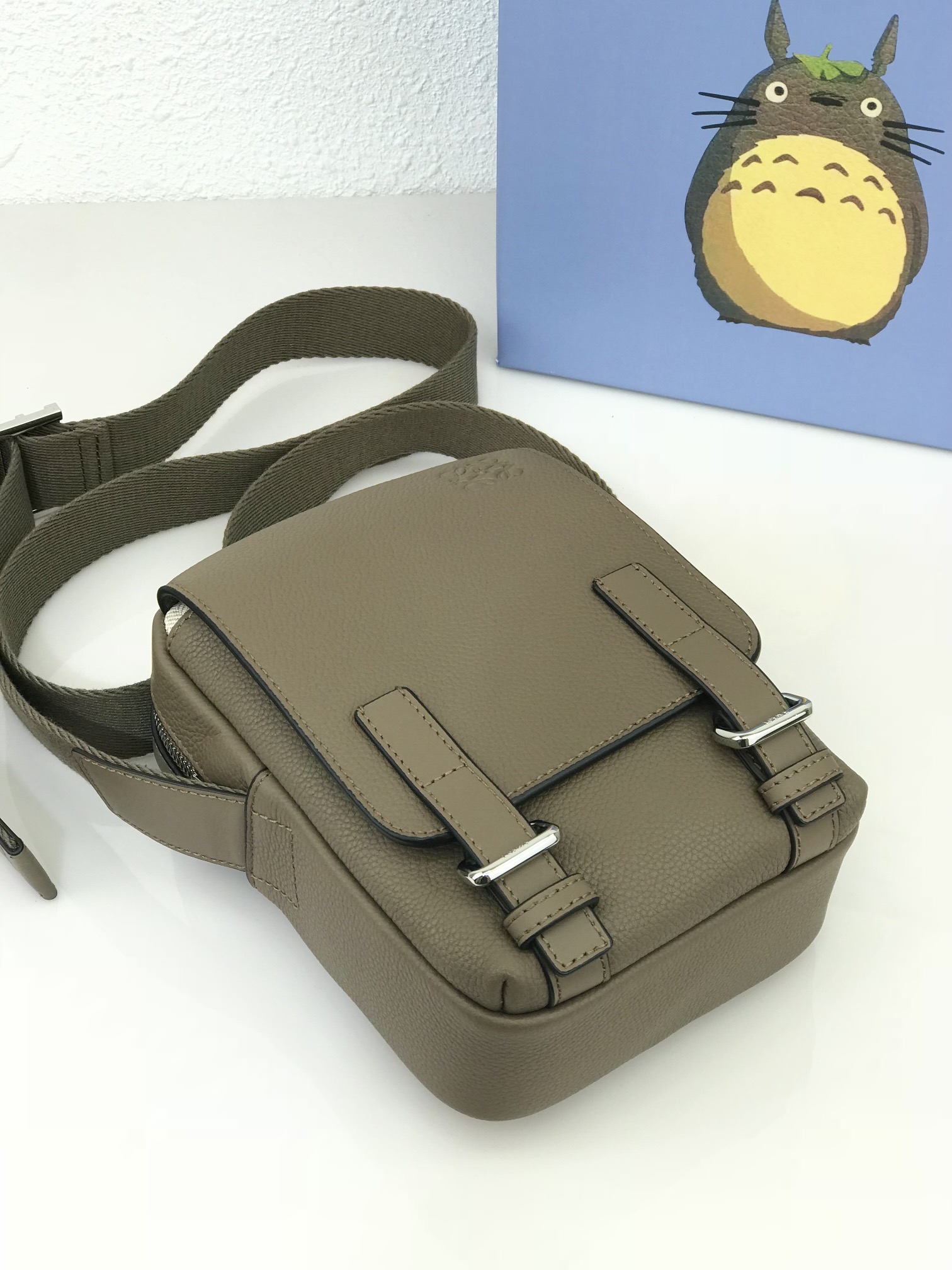 - Extra-small Military Crossboby men’s small crossbody khaki shipment, made of grainy calfskin, featuring a zipper main compartment and a compartment under the folding flip cover. It can be carried over the shoulder or crossbody, with adjustable shoulder straps. It is equipped with metal hardware engraved with a logo and opens and closes with a magnetic buckle. Model No. 11355, dimensions 14*8*19 (can hold mobile phones and power banks), comes with a box