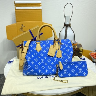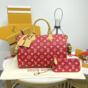 This Speedy 9 Bandouli è re 40 Monogram Leather handbag is wrapped in soft grain cowhide leather with a sheepskin lining, presenting a hazy canvas print with a silk screen Monogram pattern, expressing the creative director Pharrell Williams’ new season ingenuity. Size: 40 * 26 * 23cm